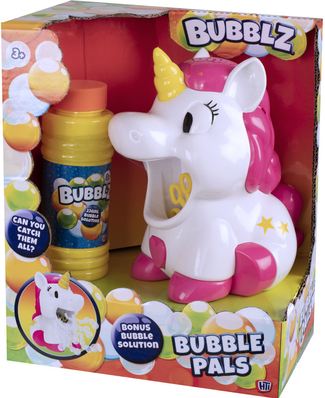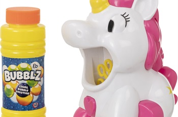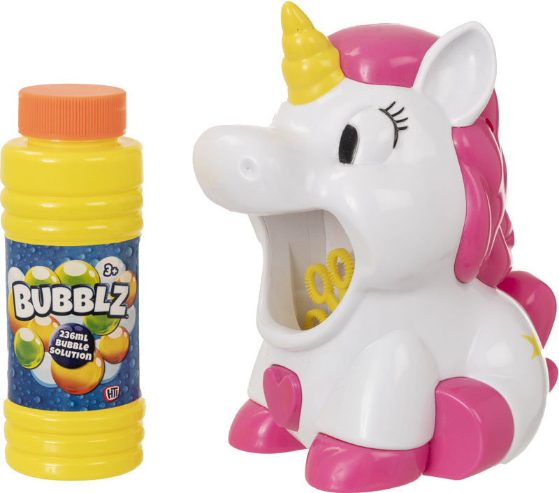 Electronic Unicorn Bubble Machine! Just tip the solution in to the wand compartment and press the button to create hundreds of bubbles. Includes 236ml bubble solution.