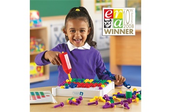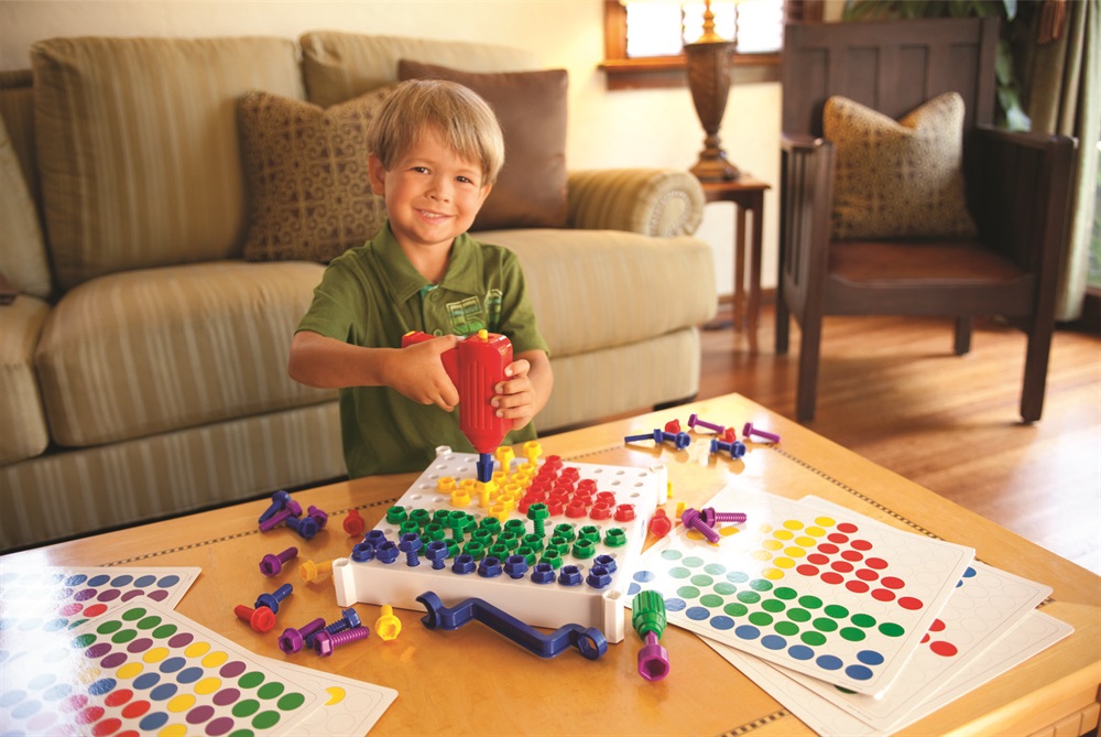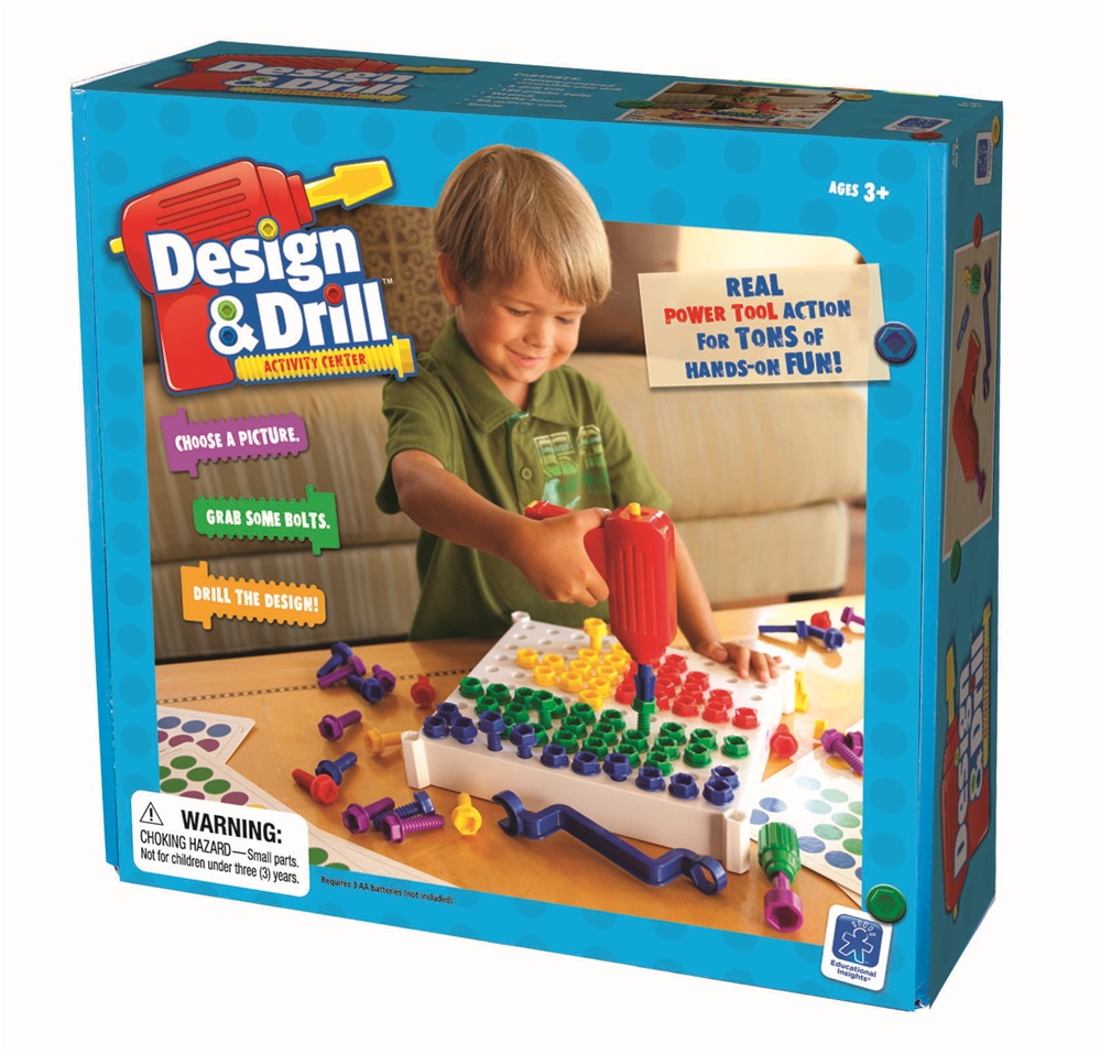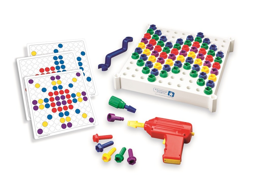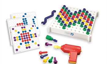 Developing fine motor skills and creativity through construction play! Children drill colourful patterns into the design board. Realistic tools develop early skills including colour recognition, counting, patterning, motor skills and following direction. This set includes 10 double sided pattern cards providing 20 full-colour activities, 100 plastic bolts in 5 vibrant colours, a combination spanner and junior power drill with reverse function. Requires 3 AA batteries (not included).