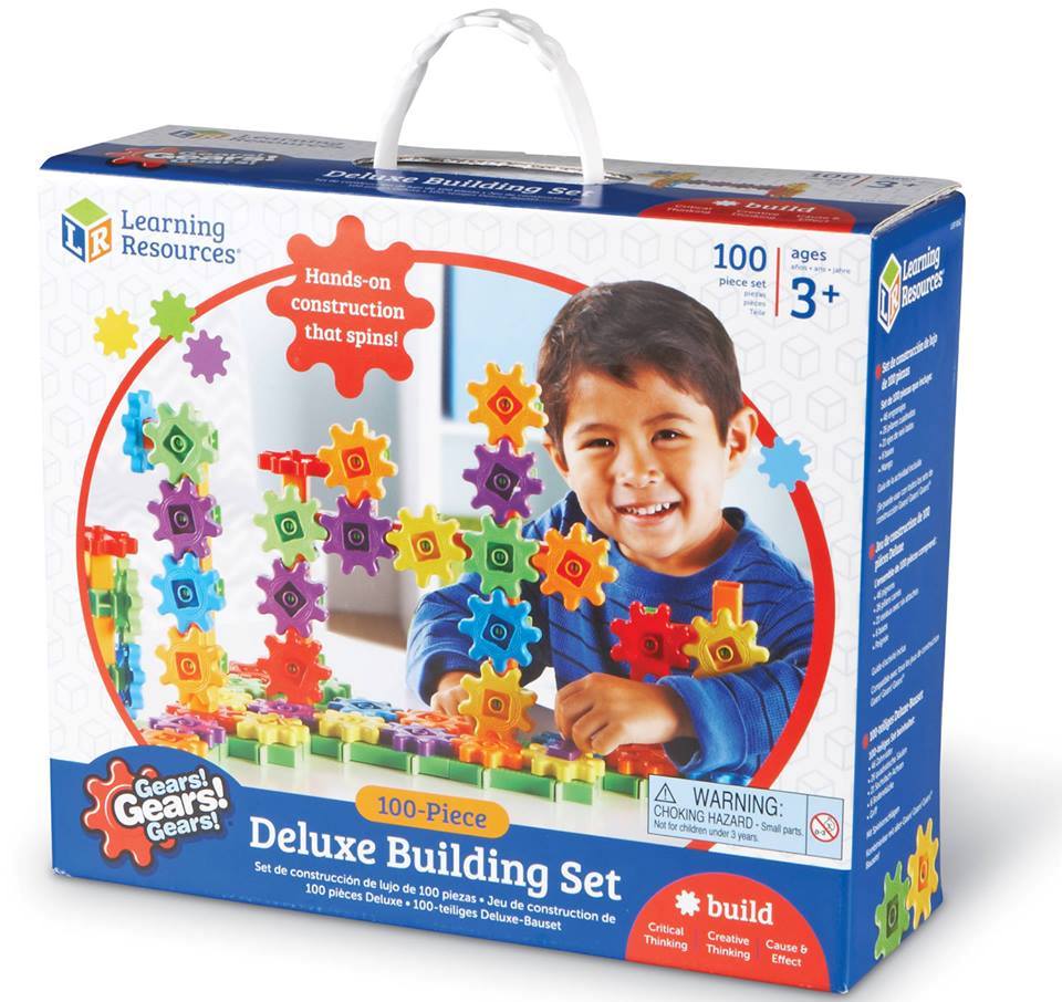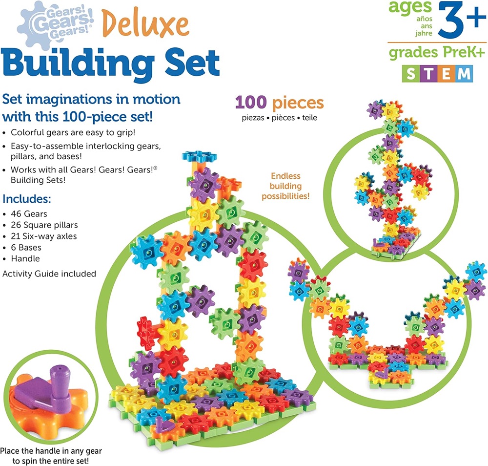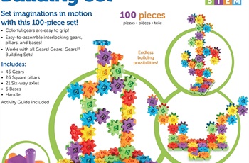 Your child can build anything in their imagination with this beginners set of Gears! This set is sure to get children creating endless colourful constructions! Set includes a giant storage box overflowing with gears, cranks, connectors and interconnecting base plates.
