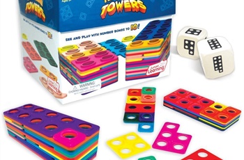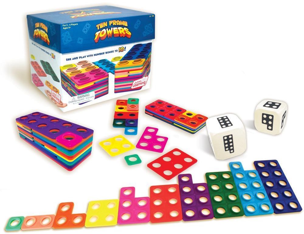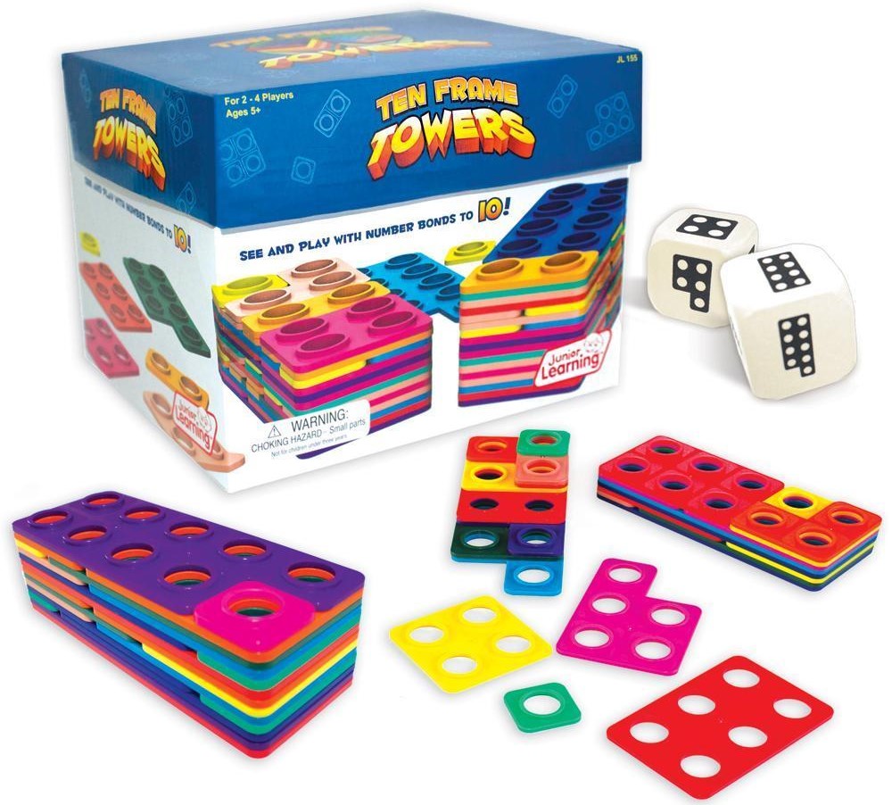 Roll the dice and stack as many Ten Frame number tile combinations as you can. The highest stacked tower wins! Build number bonds to 10 with the innovative stacking frames and develop arithmetic through multi-sensory learning. Helps students to quickly visualize numerals. Teaches counting numbers, visualizing numerals, and building number bonds. Contains 65 counting frame tiles, 2 x foam dice, activity guide. 2-4 players.