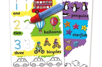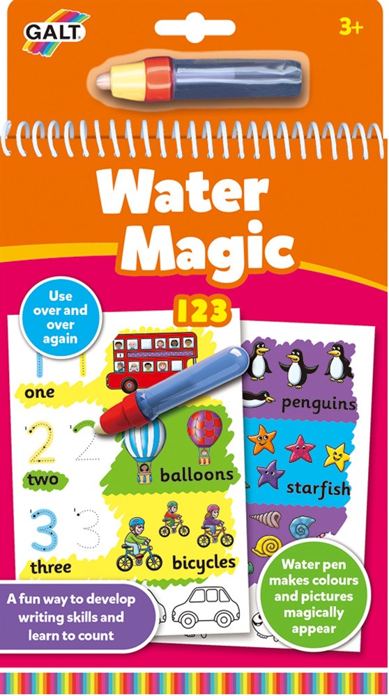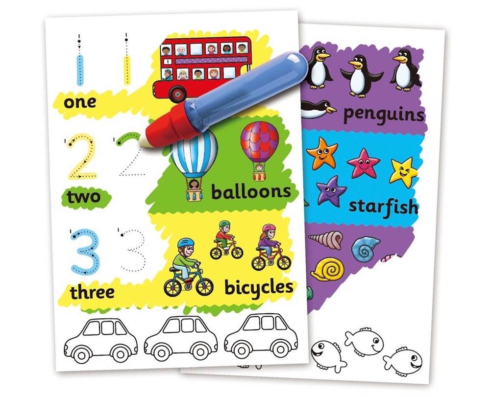 A fun way to develop writing skills and learn the alphabet with 6 reusable boards. Use the water pen to form the numbers 1 to 20 following the dotted lines and see the coloured numbers appear. Then reveal the picture with the corresponding number of items and the number word. The numbers, pictures and words will appear and later disappear over and over again. Book size: 21 x 14.7cm