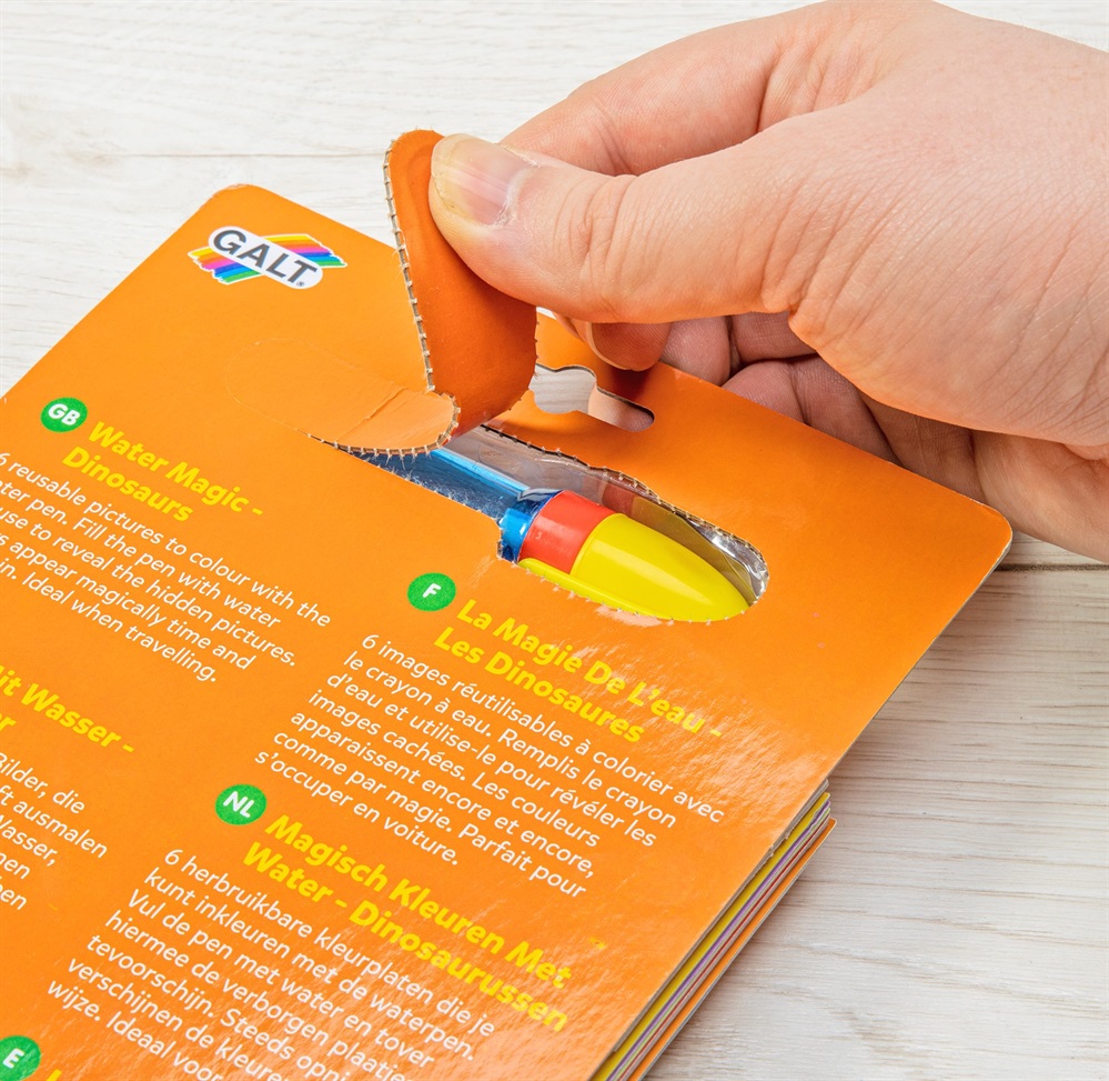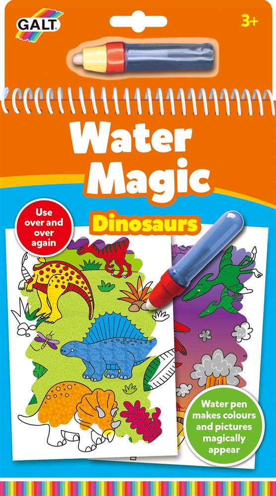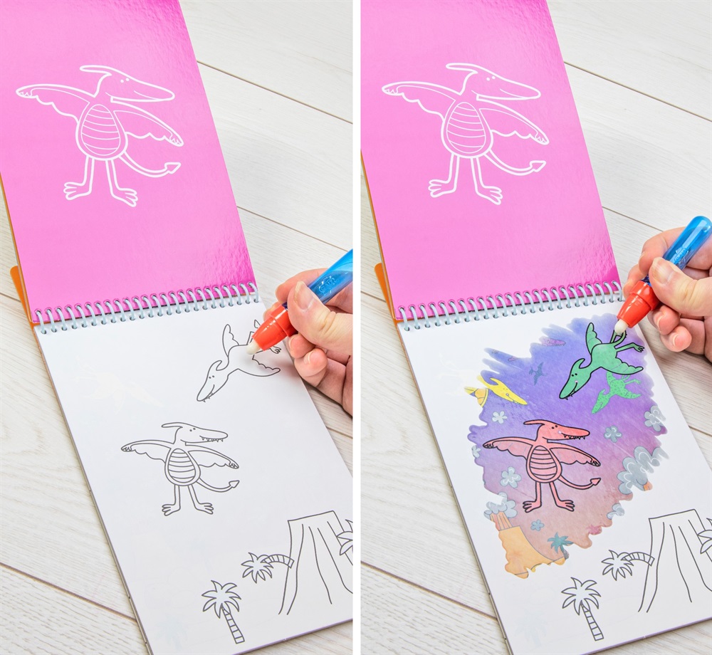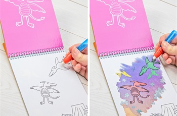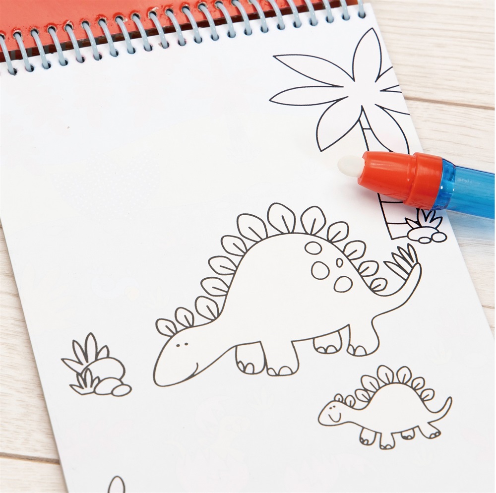These chunky spiral books feature 6 reusable pictures to colour with the water pen. Fill the pen with water and use to reveal the hidden pictures. The coloured pictures will appear and later disappear over and over again. Ideal for travel.