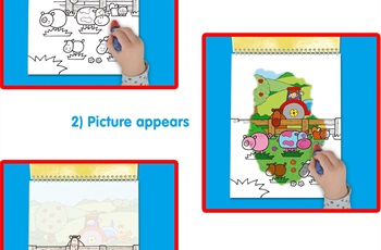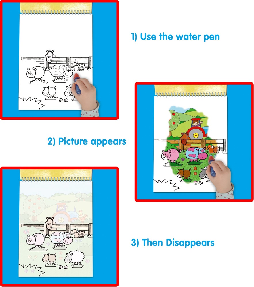 These chunky spiral books feature 6 reusable pictures to colour with the water pen. Fill the pen with water and use to reveal the hidden pictures. The coloured pictures will appear and later disappear over and over again. Ideal for travel.