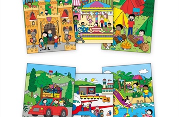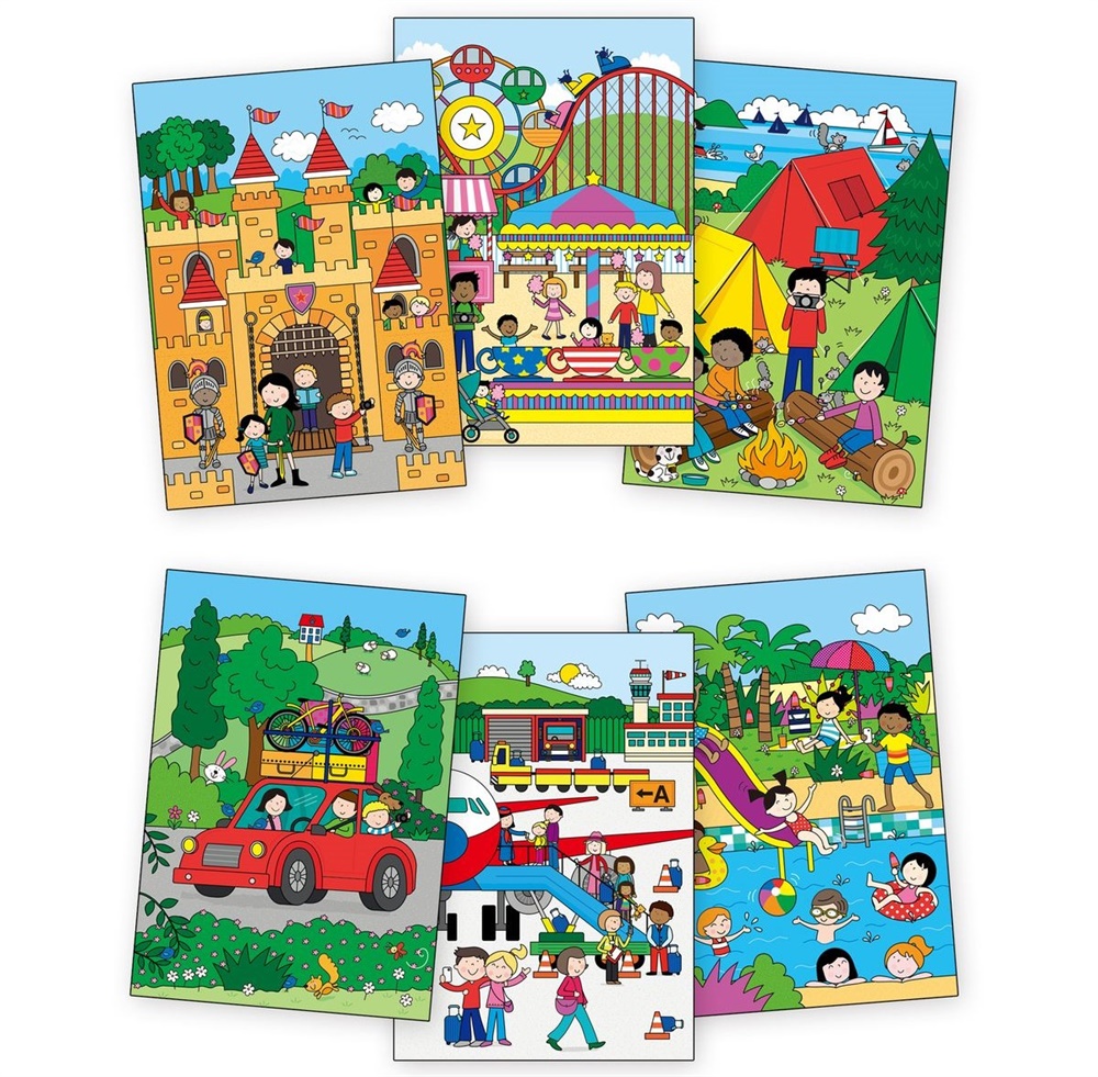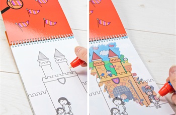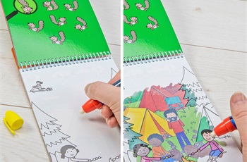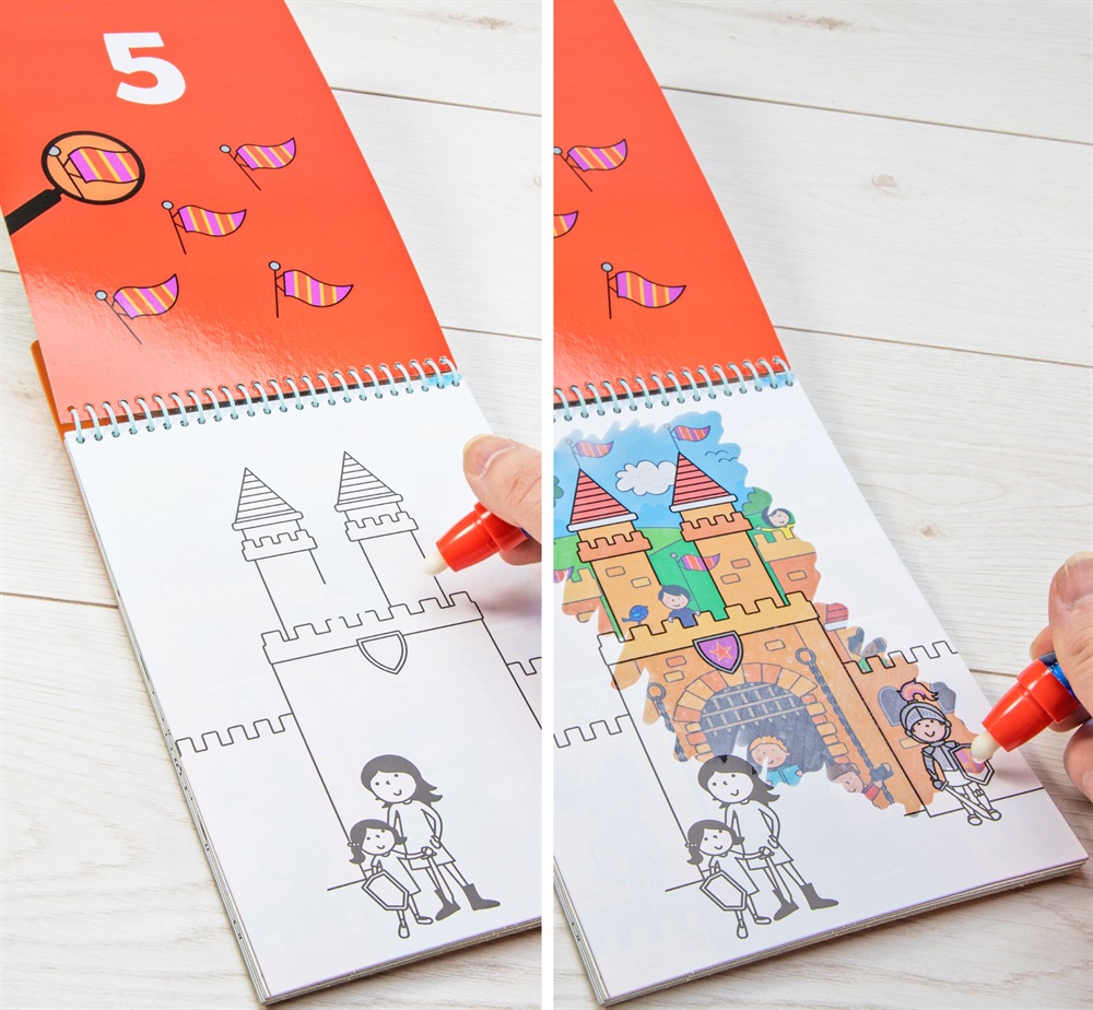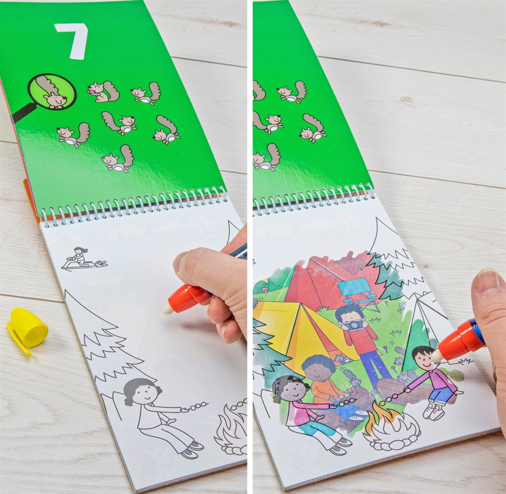 These chunky spiral books feature 6 reusable pictures to colour with the water pen. Fill the pen with water and use to reveal the hidden pictures. Then find the animal and objects in the pictures. The coloured pictures will appear and later disappear over and over again. Ideal for travel.