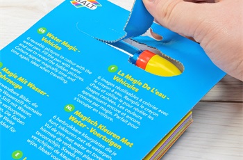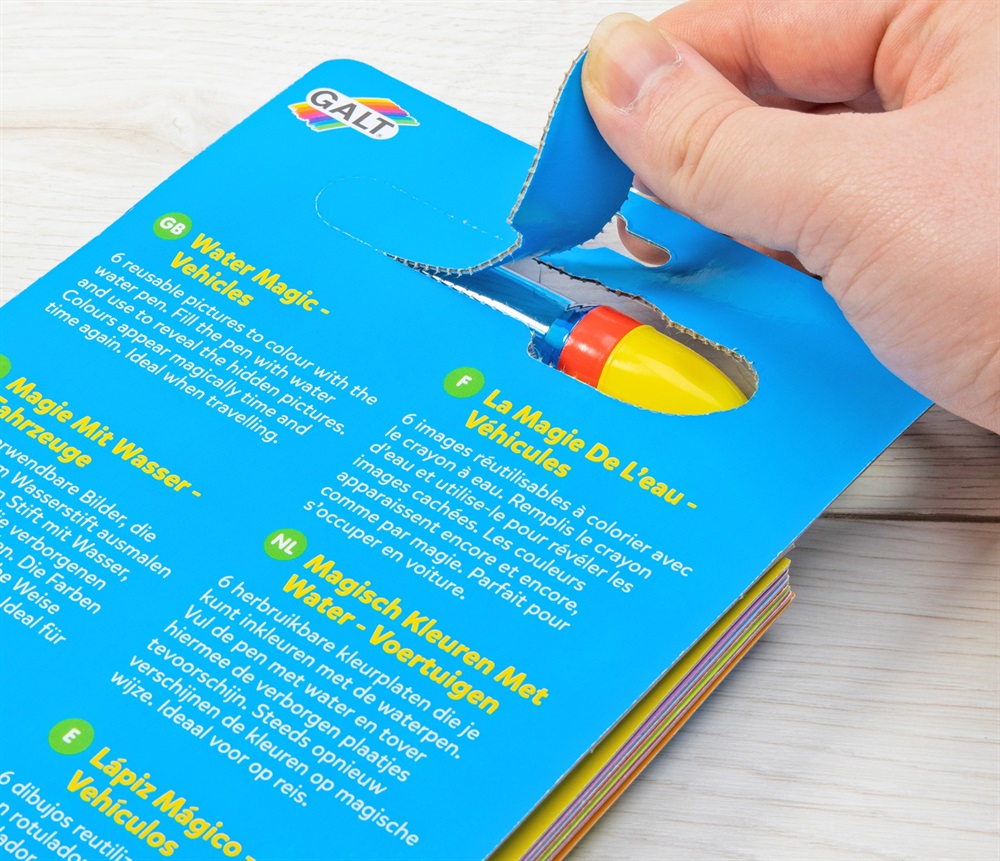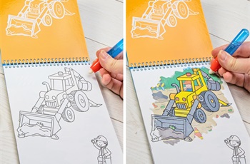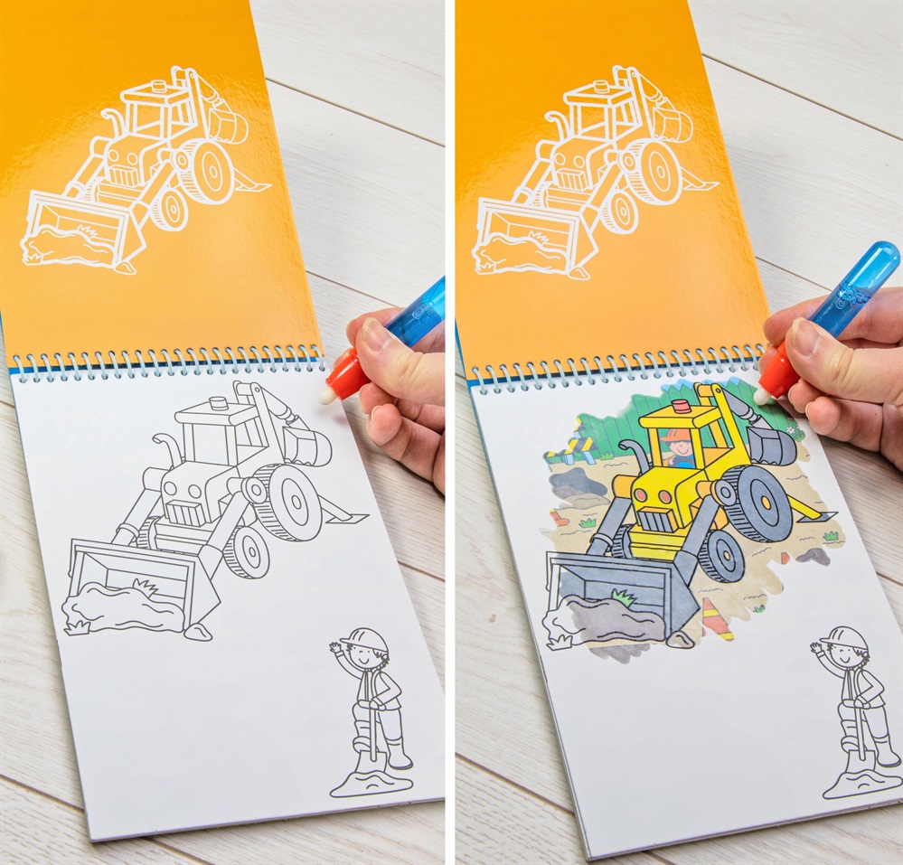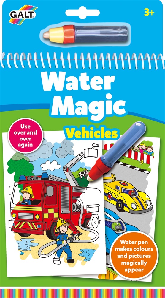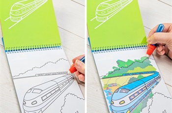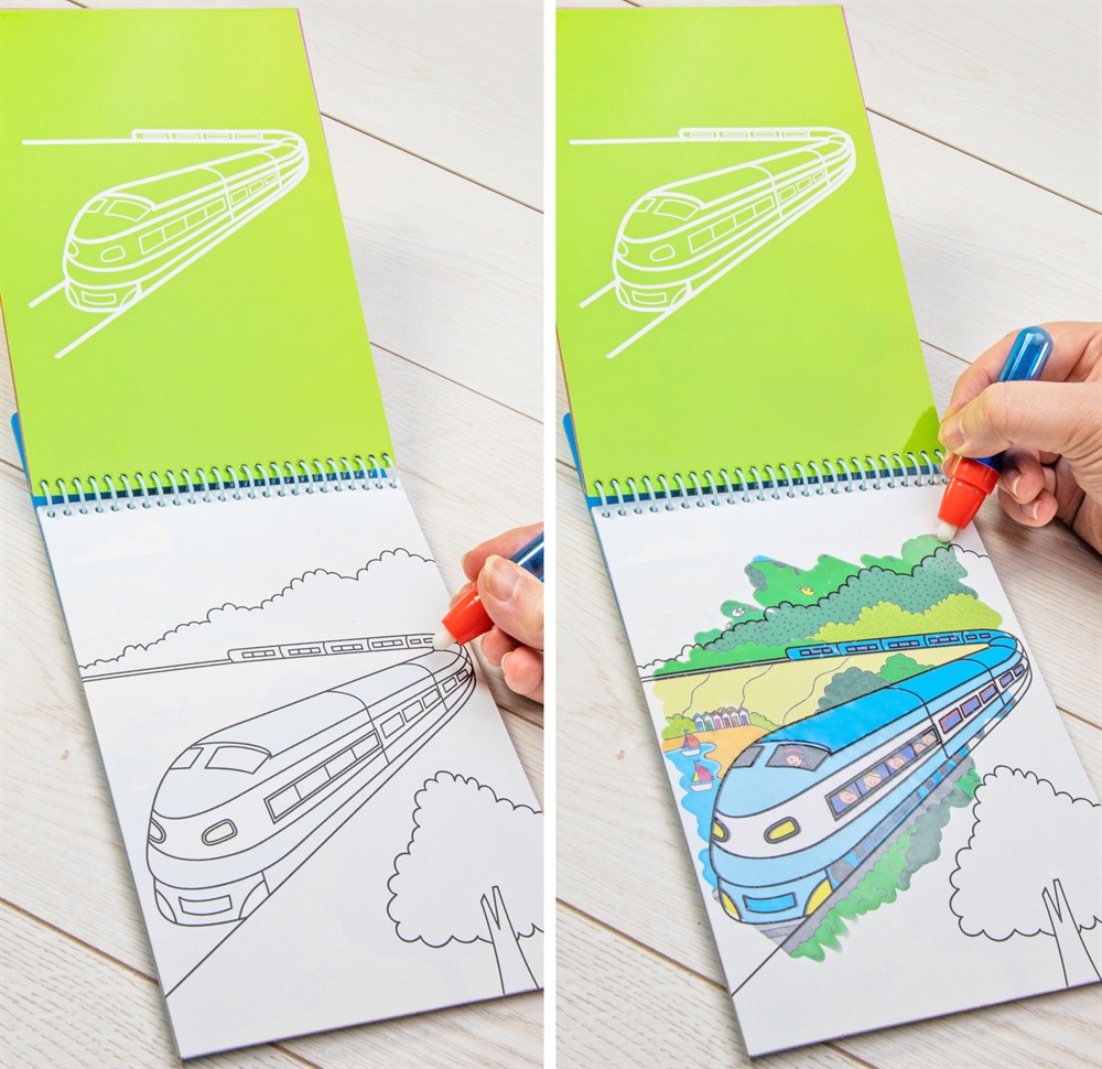 These chunky spiral books feature 6 reusable pictures to colour with the water pen. Fill the pen with water and use to reveal the hidden pictures. The coloured pictures will appear and later disappear over and over again. Ideal for travel.