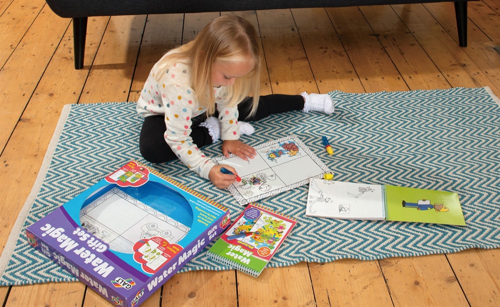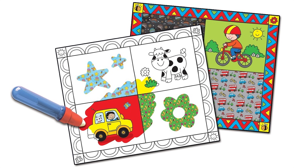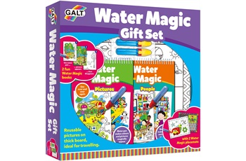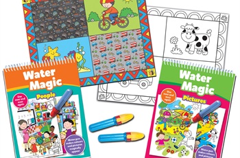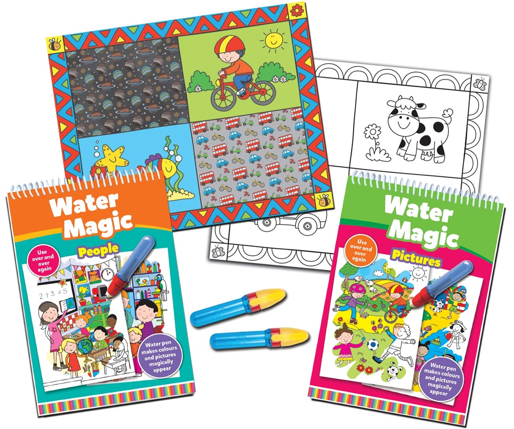 An exciting Water Magic set with reusable pictures on thick board to colour with the water pens time and time again. Simply fill the pen with water to magically reveal the hidden pictures in the picture book. Draw your own patterned pictures with the water pen on the pattern pad revealing the hidden patterns. The placemats feature a variety of hidden pictures, patterns and borders to colour. Ideal for use at home or when travelling. Item Size: Display tray: 345 x 370 x 325mm